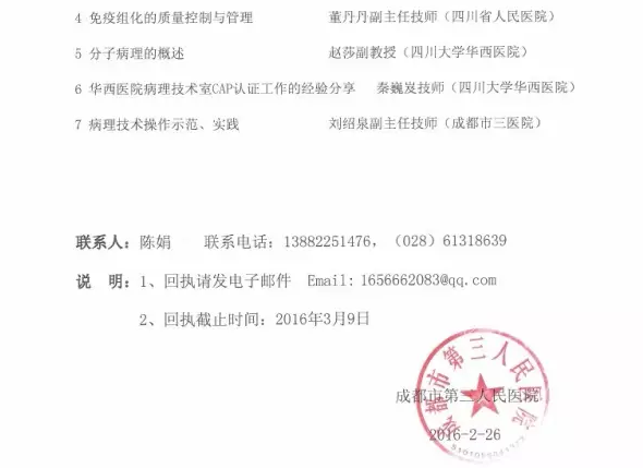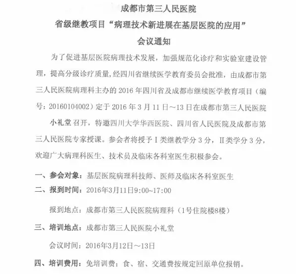 成都市第三人民医院省级继教项目“病理技术新进展在基层医院的应用”会议通知