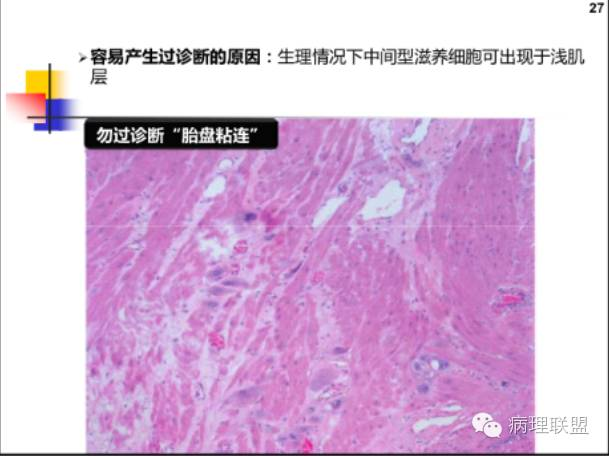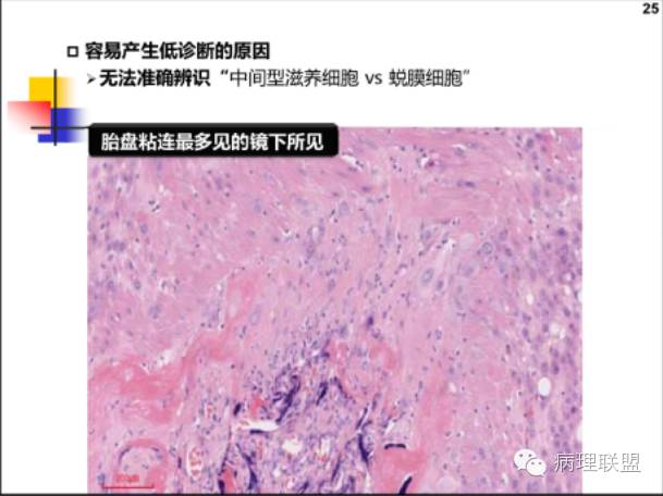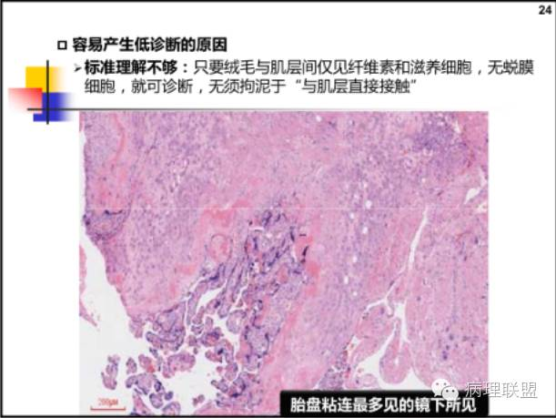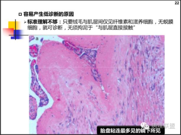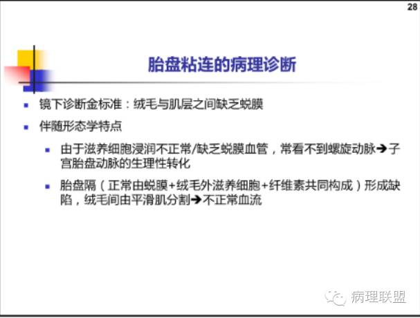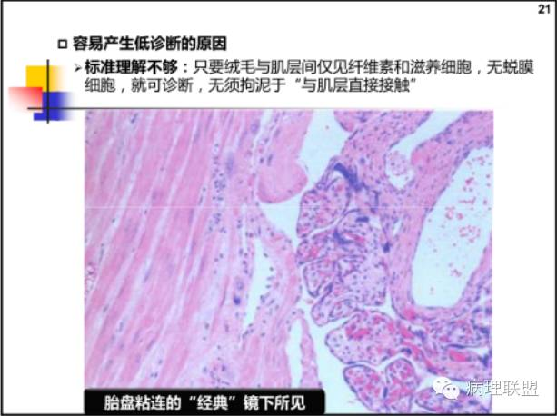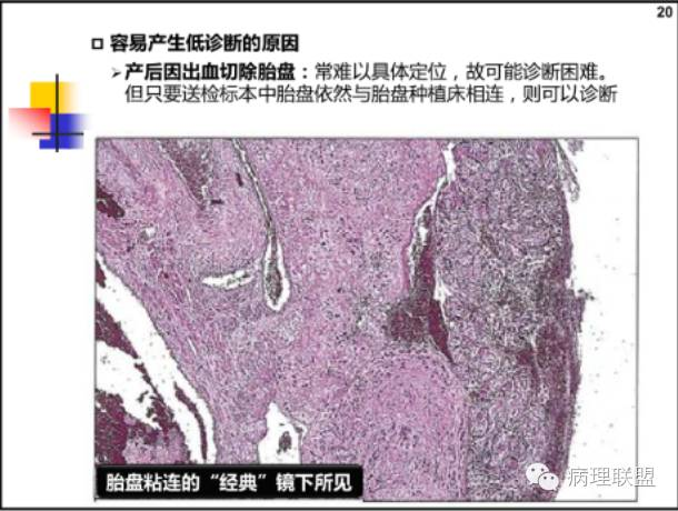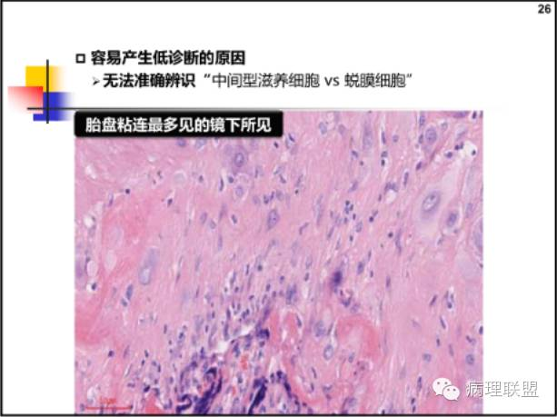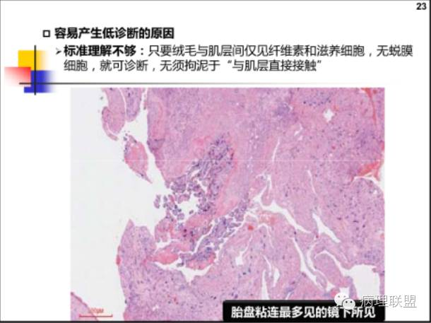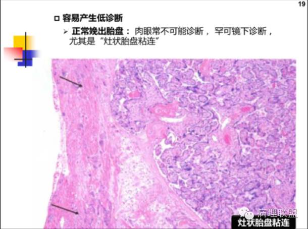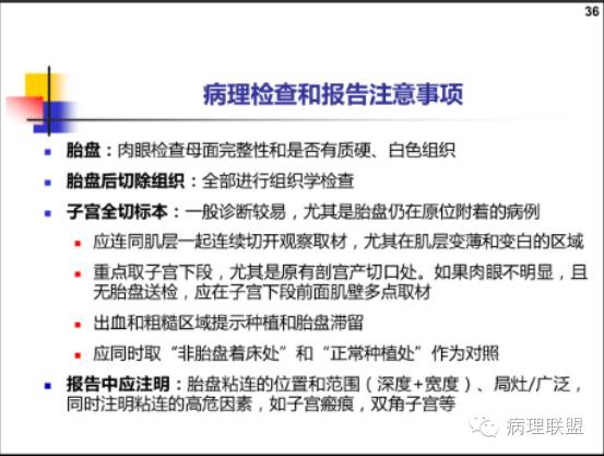 请教各位老师一个问题:一个36岁的女性,停经4个月,引产胎儿排出后胎盘未排出,然后临床刮取残留组织送检,临床考虑胎盘粘连,镜下见胎盘组织,部分区域坏死,未见到平滑肌,请问我应该怎么发报告?胎盘粘连是不是不能在刮宫标本中诊断?(晋城市人民医院病理 张勇提供,致谢!)