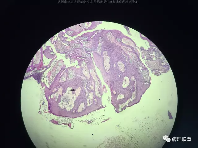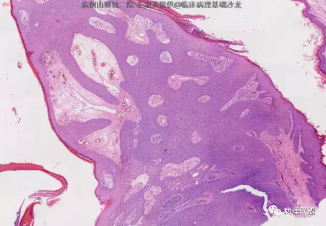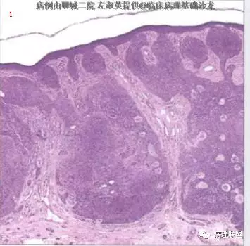 @左淑英 左老师,病例1,应该是汗腺来源,,考虑为汗孔瘤,细胞形成突起突入真皮,与表皮相连,第二张图箭头指向表示导管分化的结构,第三张图显示其纤维血管性间质,第四张图显示其有色素沉着,不知道对不对,今天我也遇着一个皮肤病例,您也给看看@左淑英