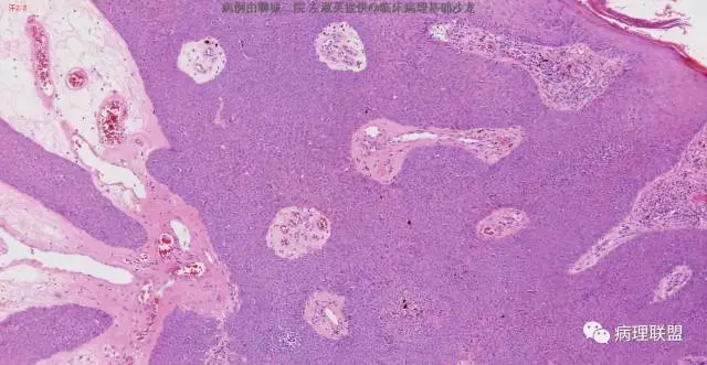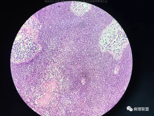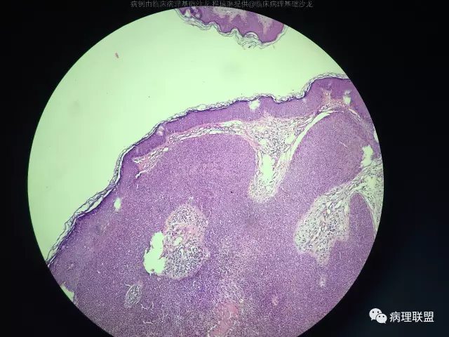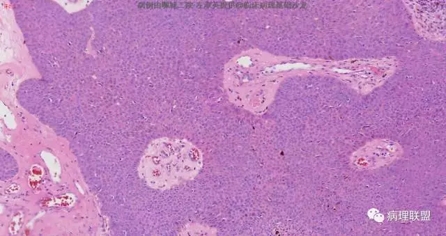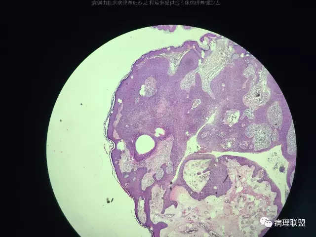 @左淑英 左老师,皮脂腺瘤,真皮浅层结节状增生物,由基底样细胞向皮脂腺分化,局部见空泡是皮脂腺的证据,肿瘤细胞浅染,有明确核仁。