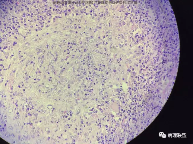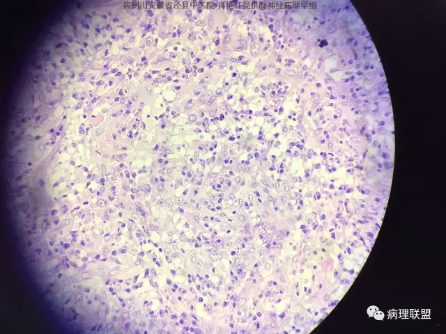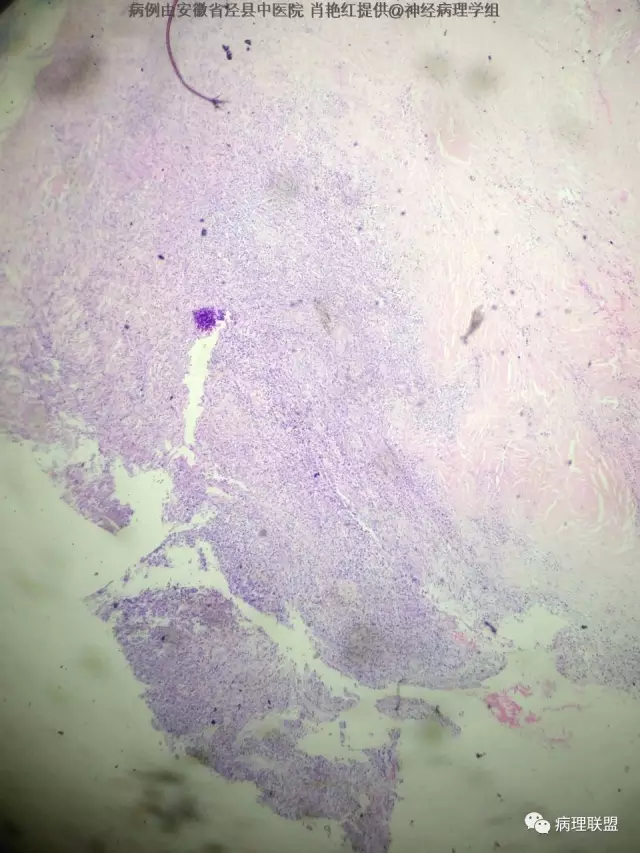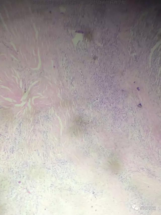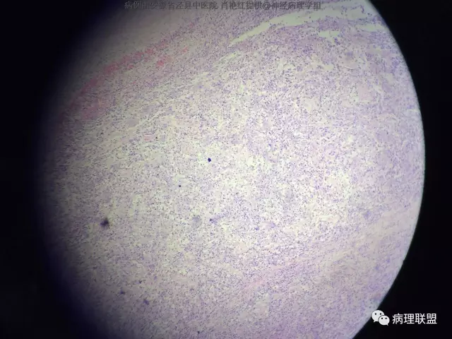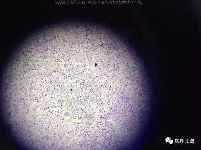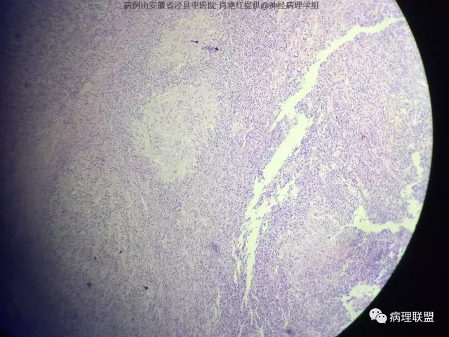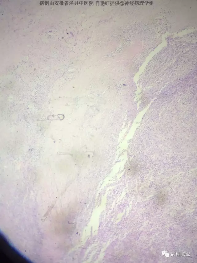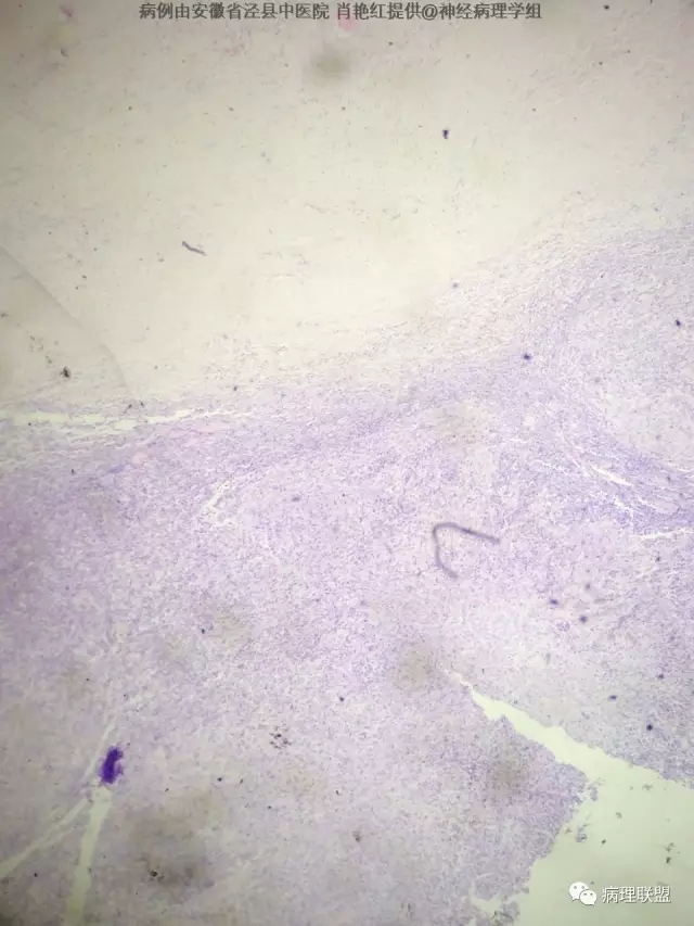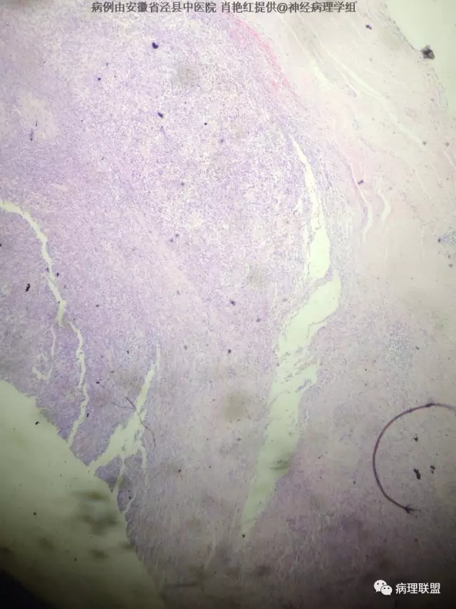 患者男,52岁,因突发头晕、恶心不适入院。头颅MRI示左侧小脑幕占位,血供分富,考虑脑膜瘤。巨检:灰白色肿物一枚,2*1.8*1.2cm,切面灰白、质中。(病例由安徽省泾县中医院 肖艳红提供,致谢!)