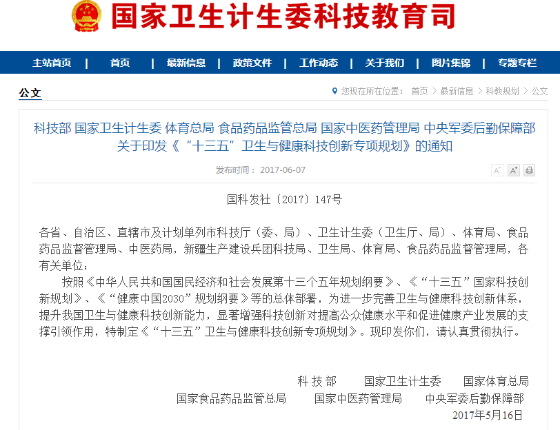 6月7日,国家六部委联合印发了《“十三五”卫生与健康科技创新专项规划》(以下简称《规划》),再次明确了生物医药行业的发展方向,并“点名”基因测序、基因编辑、干细胞、免疫治疗、细胞治疗等热门领域的工作部署,建立“科卫协同”机制,开创了科技与行业协同管理的新格局!