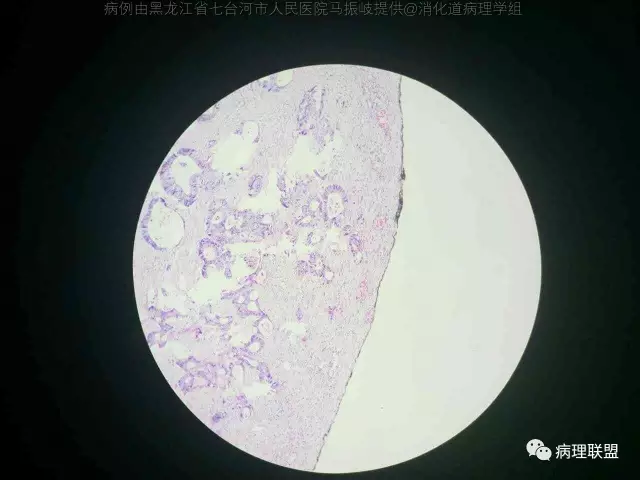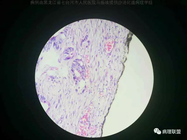结肠癌。这种,究竟算癌侵及哪个层次?侵及浆膜下脂肪,侵及浆膜,还是侵透浆膜?镜下癌距离浆膜表面不足1mm了。(病例由黑龙江省七台河市人民医院 马振岐提供,致谢!)
