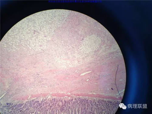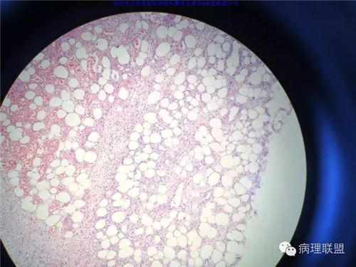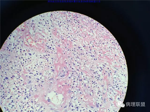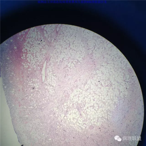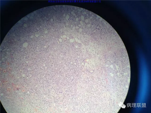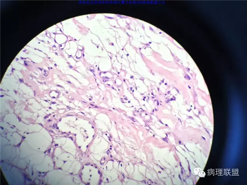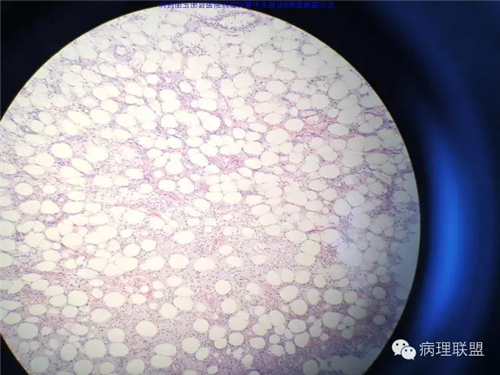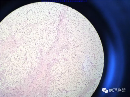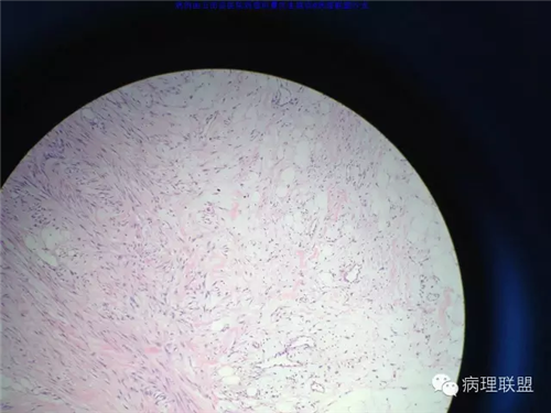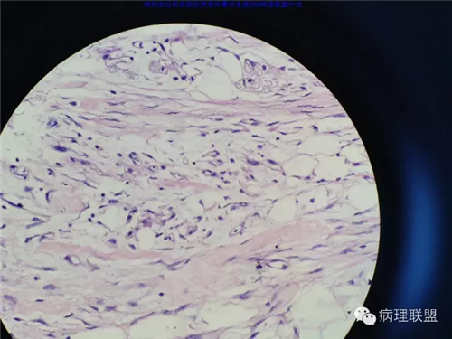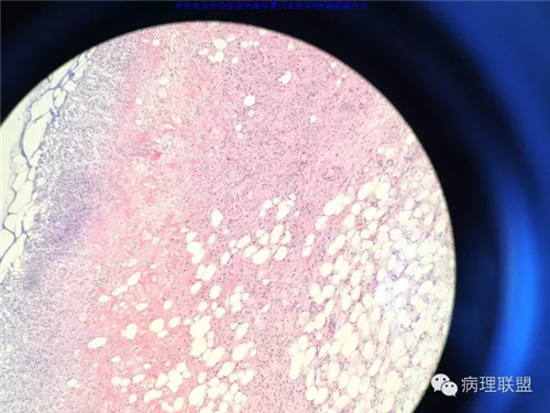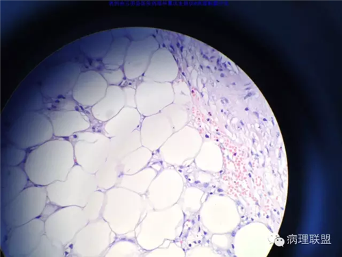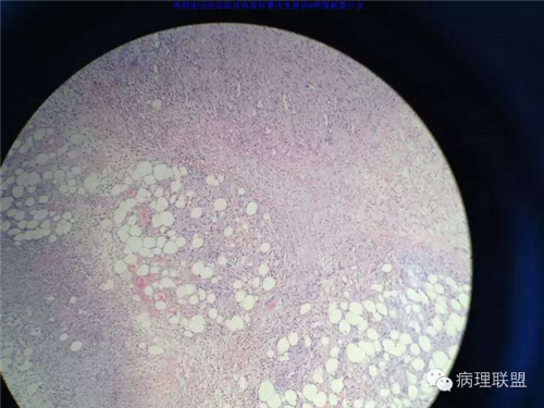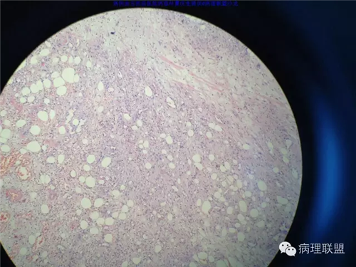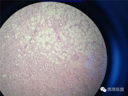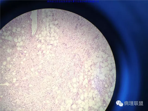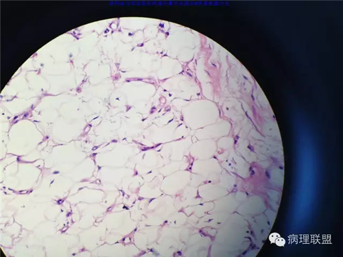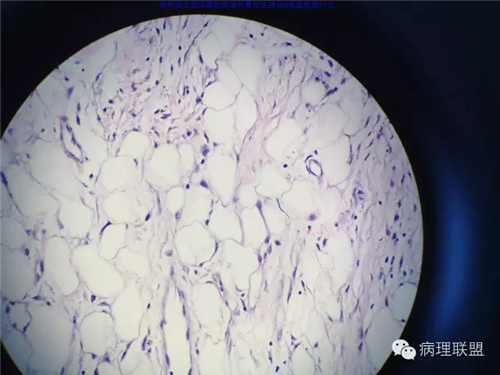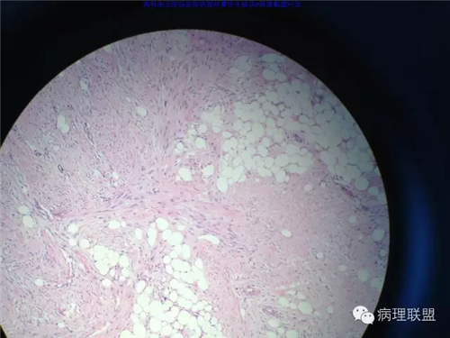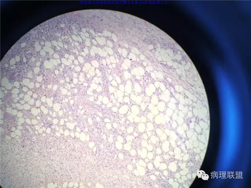 @玉田县医院病理 曹庆生 从发病率来讲,腹腔或腹膜后发生的脂肪细胞源性肿瘤,恶性远多于良性。梭形细胞脂肪瘤主要位于颈后部和肩部,较少见于面部、前额、头皮、口周颊部和上臂,非常罕见于下肢。典型病变见于老年人,平均年龄超过55岁,男性多见。表现为无症状的活动性真皮或皮下肿物,病史长。组织学谱系的一端是梭形细胞脂肪瘤,脂肪细胞之间有平行排列分化良好的梭形细胞,无分裂活性,伴有粗大的绳索样胶原束。梭形细胞之间常有大量肥大细胞,也可有淋巴细胞和浆细胞。多形性脂肪瘤为境界清楚的皮下结节,典型病变常位于男性颈部和背部,由数量不等的良性梭形细胞、核深染的圆形细胞、多核巨细胞和绳索状胶原混合构成,这种多核巨细胞常呈花环样。而非典型性脂肪瘤性肿瘤(ALT)/高分化(WD)脂肪肉瘤是最大的一组侵袭性脂肪细胞性肿瘤。占全部脂肪肉瘤的40%-45%,患者大多为中年人,发病高峰年龄50-60岁。除发生在精索的病变之外,男女发病率无差异。最常见的发病部位是发生于肢体深部软组织,尤其是大腿,其次为腹膜后、睾丸旁区域和纵隔,也可见于皮下组织,非常罕见于皮肤。一般为深在性、无痛性、逐渐长大的肿物,尤其发生在腹膜后者可长至很大。发生于腹膜后的病变在<20cm之前常无症状,偶然发现。镜下,ALT/WD脂肪肉瘤由相对成熟的增生的脂肪组织构成,与良性脂肪瘤相比,细胞大小有显着性差异。脂肪细胞核有局灶异型性以及核深染有助于诊断,常见散在分布的核深染的间质细胞和多核间质细胞,核深染的间质细胞更多见于纤维间隔内。可见数量不等(很多至完全没有)的单泡或多泡脂肪母细胞。硬化性脂肪肉瘤在ALT/WD脂肪肉瘤中发病率居第二位,最常见于腹膜后或睾丸周围区域,镜下主要结构是散在分布的核明显深染的奇异型间质细胞,伴有少数多泡脂肪母细胞,间质有多量纤维性胶原。偶尔肿瘤大部分由纤维性成分构成,小块组织活检时很容易将含量有限的脂肪成分忽视甚至漏掉,因此要将标本充分取材,肉眼表现不同的区域均应取材。因此,首先从部位上看,基本上就排除了良性脂肪细胞肿瘤的可能,尽管肠壁上可以发生良性的脂肪细胞肿瘤,但罕见,而且常表现为粘膜下境界清楚的肿物,很少发生于浆膜层。分子遗传学改变方面:ALT/WD有12q14-15区段的扩增,该区域包括MDM2,CDK4,以及HMGA2等,而梭形细胞脂肪瘤/多形性脂肪瘤则大部分病例有13号和/或16号染色体单体或部分丢失。