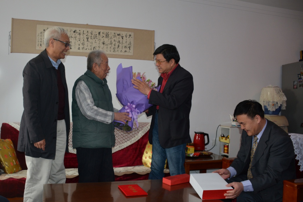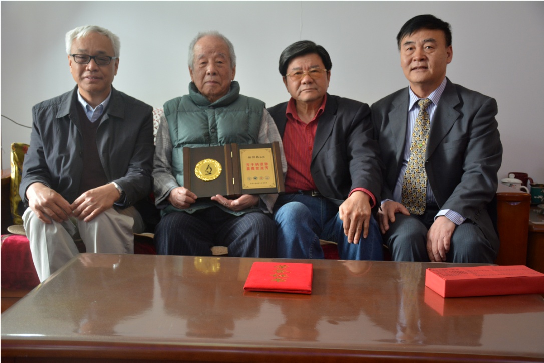 赫老入座后,丁彦青教授表明了此次来访的目的:“我们代表国内病理界的四大学会看望您,您是我们德高望重的老前辈,以表达我们对您的敬意。”随后丁华野教授为赫老献花,王恩华教授为赫老颁发由中华医学会病理学分会授予的“中国病理事业突出贡献专家”证书,赫老时不时还对大家说对于这个荣誉,感到很惭愧。丁彦青教授最后给赫老颁发了病理人足迹的纪念牌,“介子纳须弥,显微世流芳”,是赫老的一生写照。