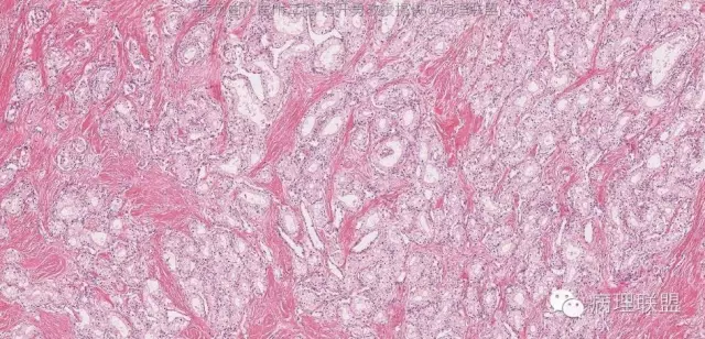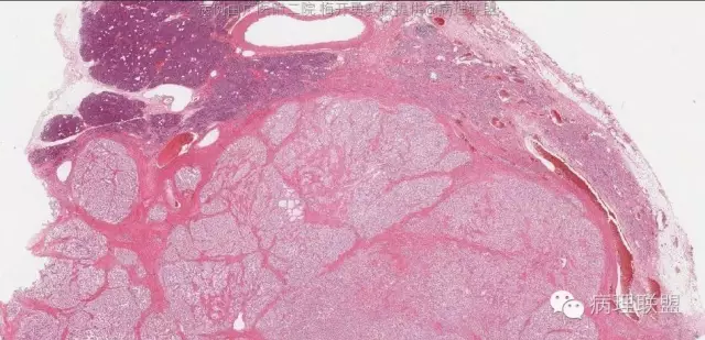 肿物与正常胰腺组织分界清楚,肿瘤组织被纤维组织分隔成巢状。