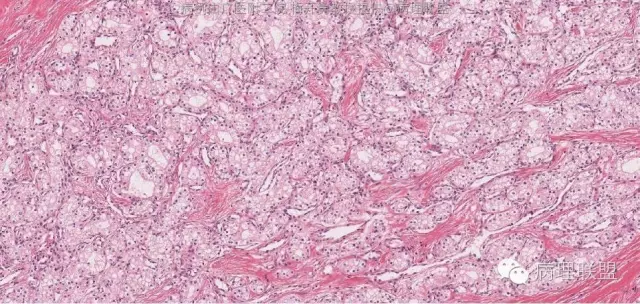 肿瘤细胞排列成腺管状或腺泡状,腺管或腺泡排列紧密,背靠背。瘤细胞形态与浆液性囊腺瘤的瘤细胞形态完全一致。因此,诊断为浆液性囊腺瘤,实体型。