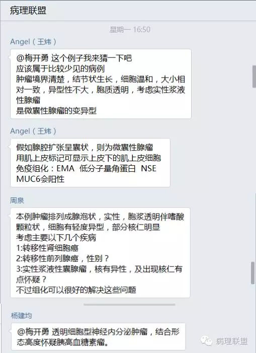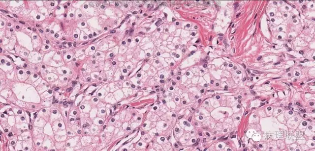 瘤细胞呈立方形,胞浆透明,核染色质粗,见小仁。未见核分裂。细胞边界清楚。