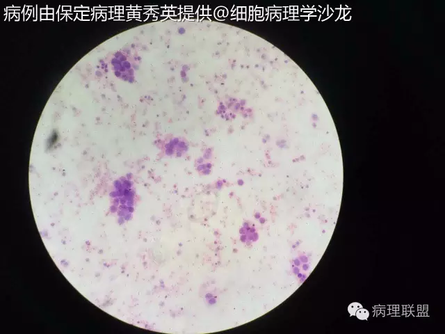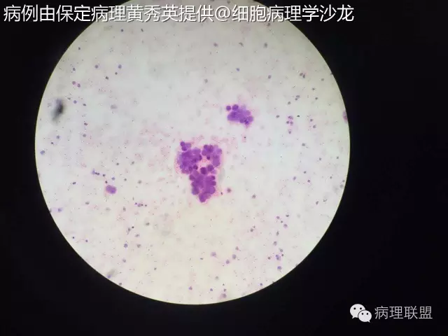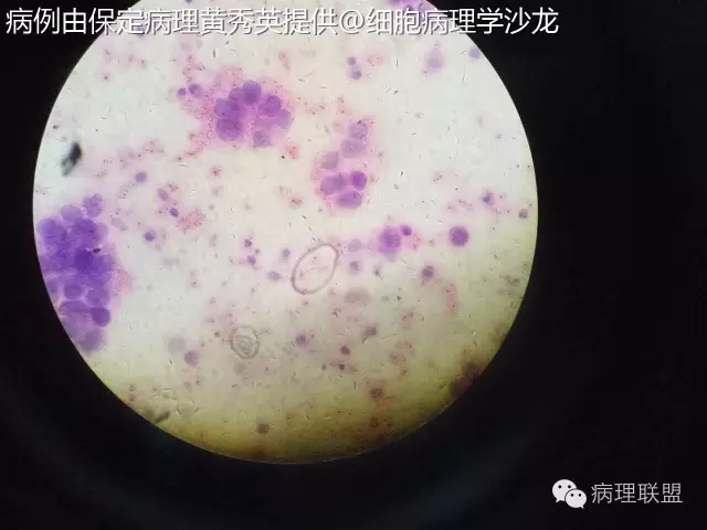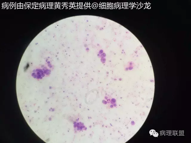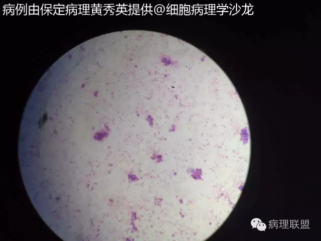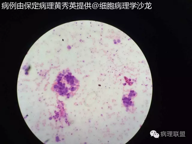 @保定病理黄秀英 拍的不是很清楚,但癌能定,仔细看细胞内看到空泡,腺样结构,腺癌首先考虑,将胸水抽完后再做CT。