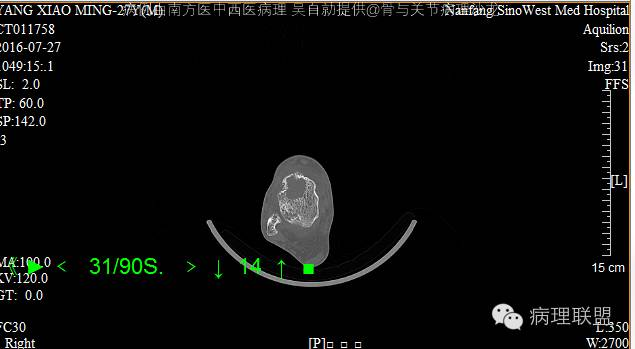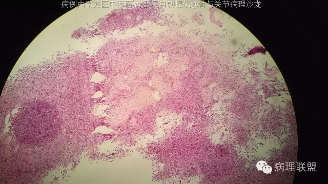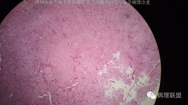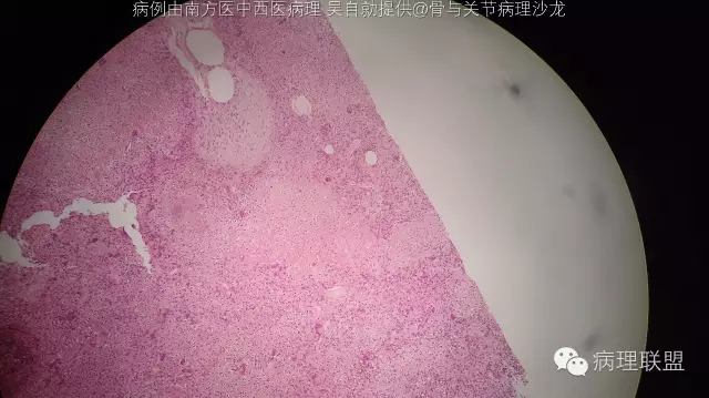 @南方医中西医病理 吴自勍 问问影像科的意见,软骨母还是骨肉瘤。我们镜下改变只占三分之一,感觉像软骨母,但年龄稍大。