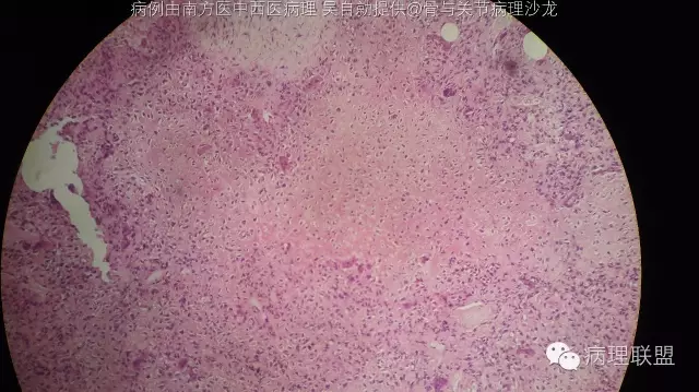 @南方医中西医病理 吴自勍 ,这例我考虑软骨母细胞瘤,红染的是软骨样基质,你可以做下S100,D2-40,阳性均支持软骨母,细胞不异型,是典型的软骨母细胞形态。同意@浙江嘉兴 周泉 的分析。