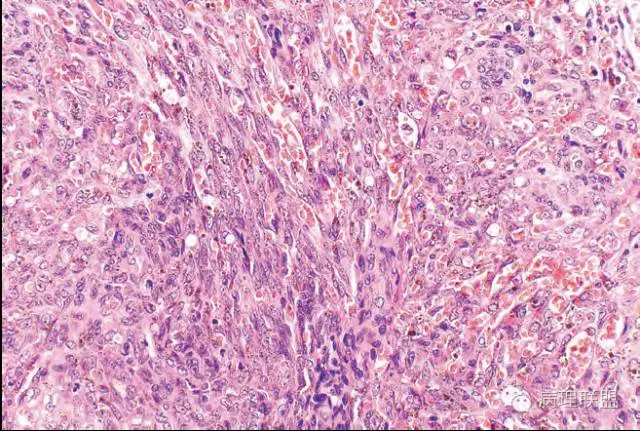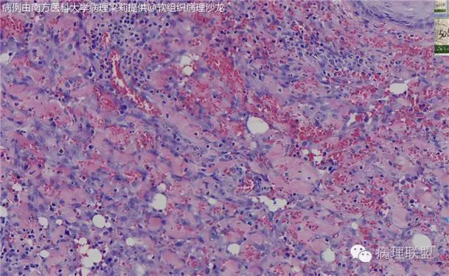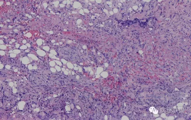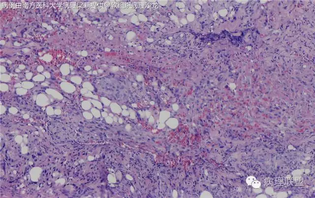 这例我们发的是卡波西样血管内皮细胞瘤,考虑如下:(1)新生儿,肢体肿物;(2)位置深,侵及皮下脂肪;(3)大多是裂隙状血管,也有少量吻合的血管网,细胞有异形,可见坏死