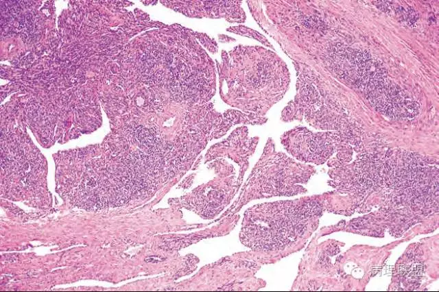 Kaposi型血管内皮瘤常有隐约小叶结构,梭形细胞束间有毛细血管,细胞核异型性和分裂活性一般不明显,常见梭形细胞束和圆形"肾小球样"实性细胞巢混合存在。