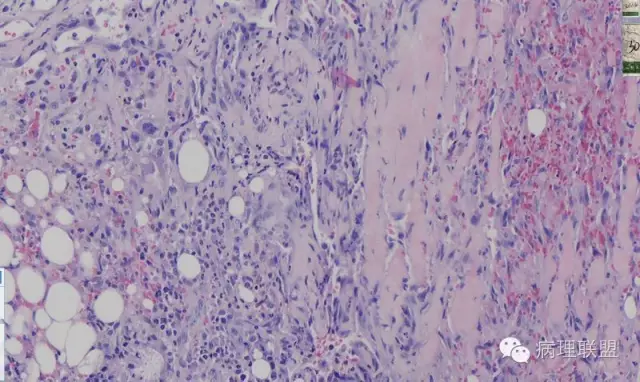 注意活跃增生的内皮细胞总是与纤维素关系密切,并非穿插浸润的真皮胶原束。