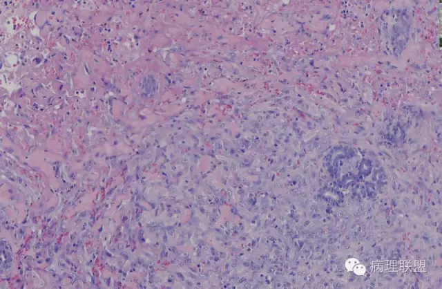 混合型血管内皮瘤虽是混合各种形态,但是其主要成份一定是内皮瘤成份,上皮样血管内皮瘤或网状血管内皮瘤成份,其它血管肉瘤,血管瘤次要。@广医二院_病理科_梅开勇 仔细看了,好像是胶原。