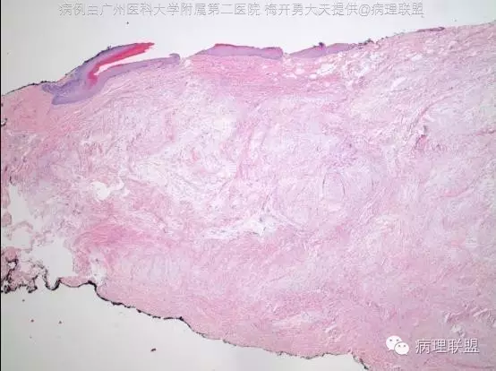 3、获得性指纤维角皮瘤、甲周/甲下纤维瘤:也好发于手指和足趾,并可起自于甲床,偶可位于手掌、足背、足底和足跟。被覆表皮可伴有增生和过度角化。与SAFM相比,病变内细胞和血管均稀疏,表现为真皮内大量垂直性增生的胶原组织,间质可伴有水肿,并可有少量炎性细胞浸润。