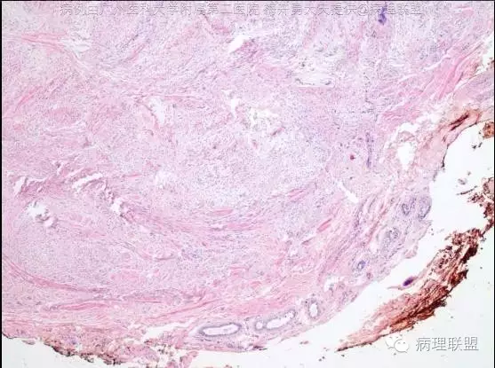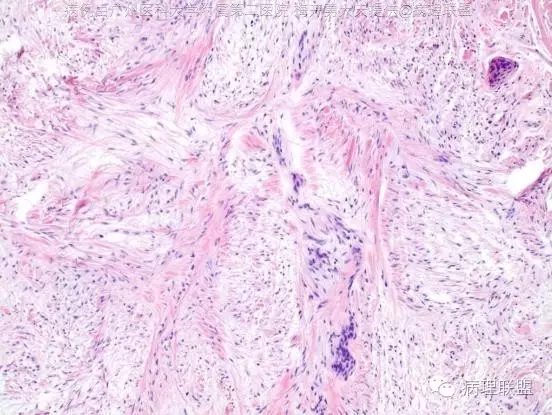 5、皮肤硬化性神经束膜瘤:好发青年人(中位年龄24.5岁)的手指,偶可位于手掌,病变内含有大量的胶原纤维,可见上皮样和梭形细胞,呈条索状、梁状或旋涡状(洋葱皮样)排列,可表达EMA和CD34。