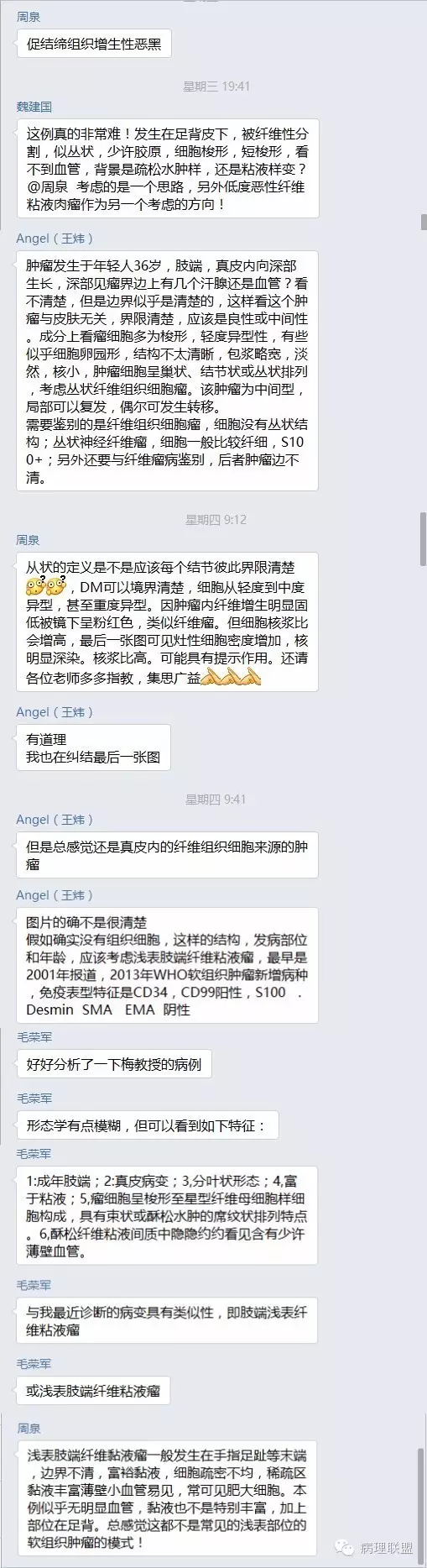 简要概述形态学特点正如王炜博士及毛主任所言:1、成年肢端,2、病变位于真皮层,3、肿瘤呈分叶状,4、富于粘液,5、瘤细胞呈梭形至星型纤维母细胞样细胞构成,具有束状或疏松水肿的席纹状排列特点,6、疏松纤维粘液间质中隐约可见含有少许薄壁血管。