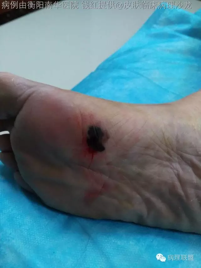 女,71岁,足底黑斑多年,最初为蓝色,逐渐增大(病例由衡阳南华医院 钱红提供,致谢!)