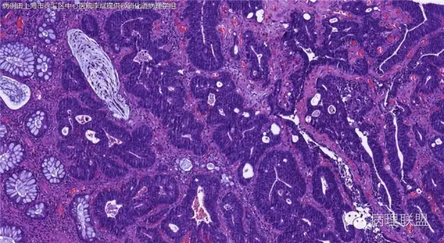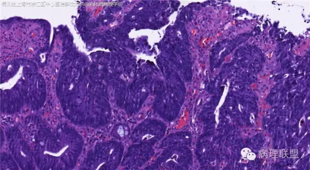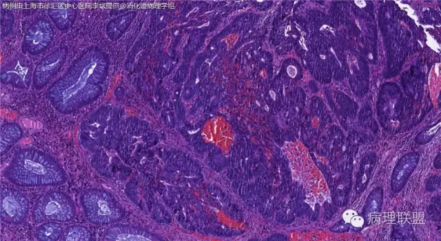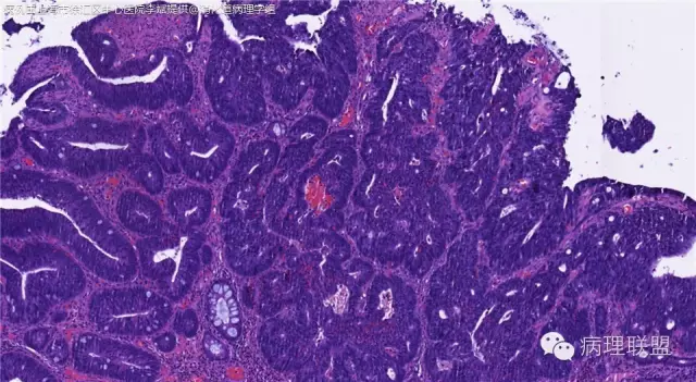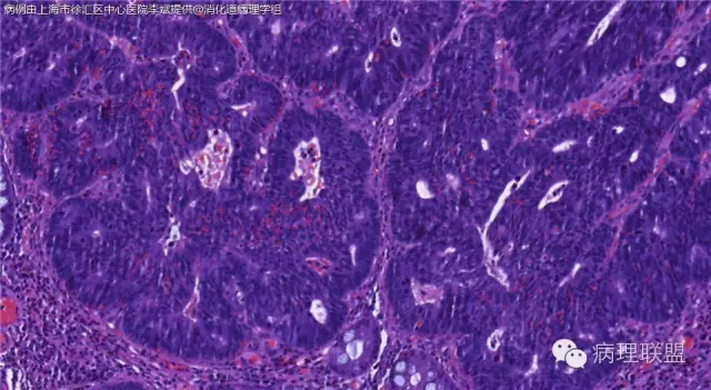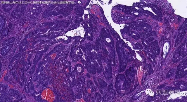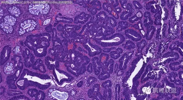 @李斌 结肠腺瘤这例我认为已经有黏膜下浸润了,因为有些腺体间的间质已经不是固有膜间质而是促结缔组织增生反应的间质了。但即使有浸润癌,如果息肉完整摘除、癌成分分化好、没有脉管瘤栓、浸润癌距切缘大于1mm(日本标准还要看浸润癌超出黏膜肌深度和肿瘤出芽情况),也不需要进一步治疗。所以,对于这类可能存在争议的病变,特别是息肉已经完整切除的病例,诊断的关注点就应该放在寻找需不需要进一步治疗的证据上了。@邓永键 2010版WHO在腺瘤部分的陈述中已经写出对于有局灶浸润性生长的病例也可以称黏膜内癌,他们在悄悄的让步。